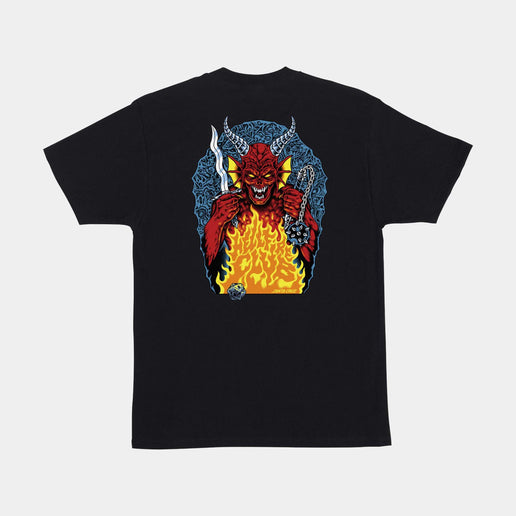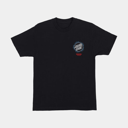 The Santa Cruz Stranger Things Hellfire Pit men's short sleeve regular fit t-shirt features small front and large back Santa Cruz x Stranger Things Hellfire Pit artwork; printed in soft hand ink.